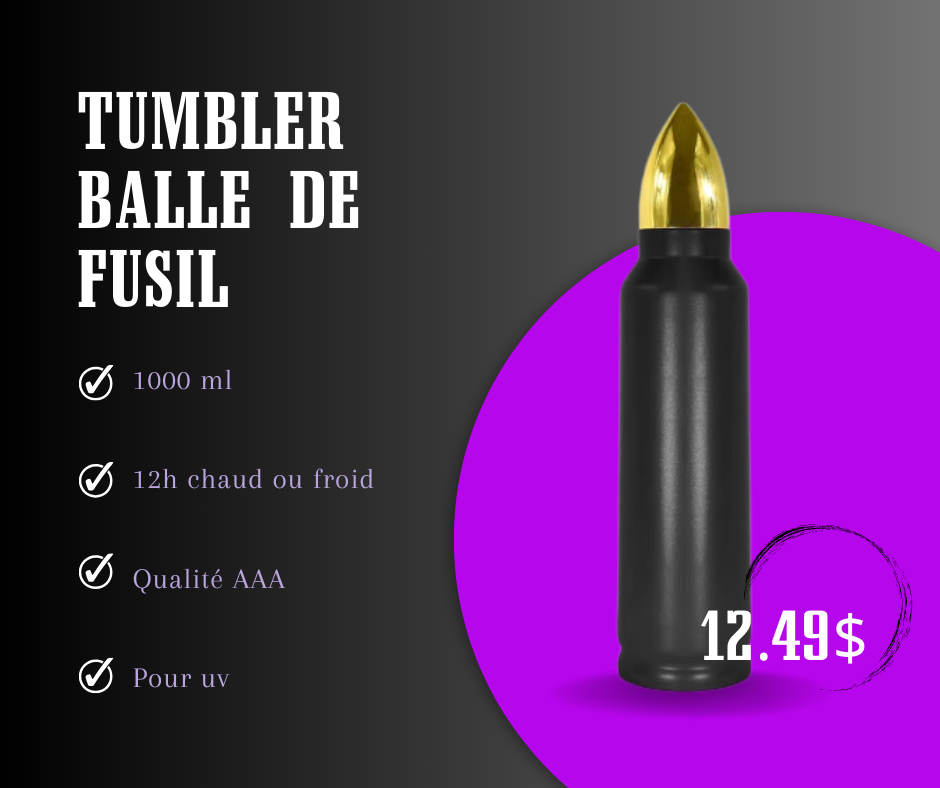 Découvrez notre tumbler en forme de balle de fusil ! Son design original et sa qualité garantissent une expérience de boisson unique. Idéal pour les amateurs d'armes à feu. Ne manquez pas cette opportunité d'avoir un tumbler différent de tous les autres.